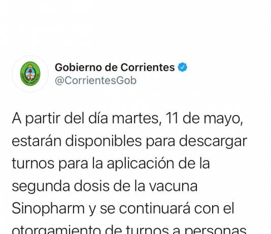 Se podrán descargar turnos para la segunda dosis de la Sinopharm y se otorgarán nuevos turnos para mayores de 55 de toda la Provincia