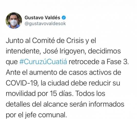 Valdés informó que Curuzú Cuatiá retrocede a fase 3