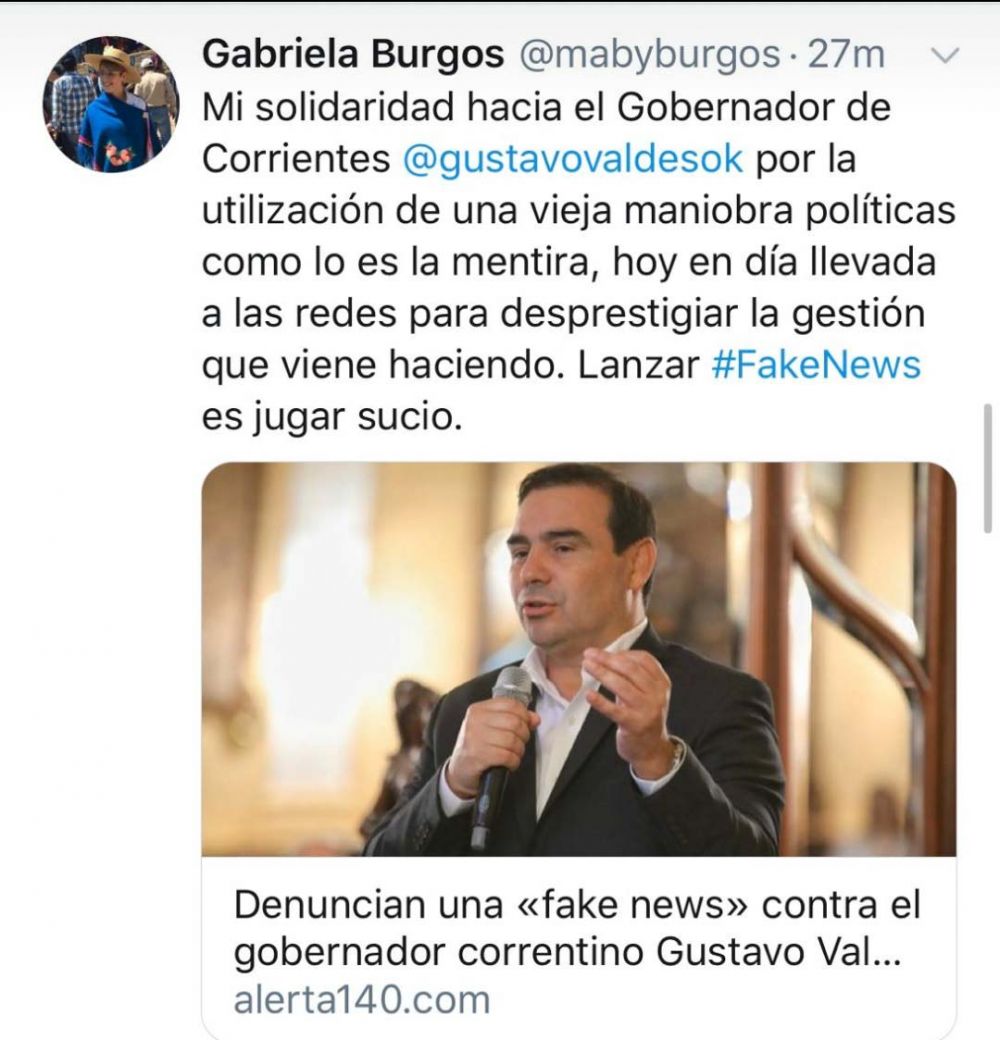 Por su parte la diputada Gabriela Burgos además de solidarizarse, calificó el hecho como “la utilización de una vieja maniobra política como lo es la mentira, hoy en día llevada a las redes para desprestigiar la gestión que viene haciendo. Lanza la Fakenews es jugar sucio” aseguró la legisladora también mediante twitter.