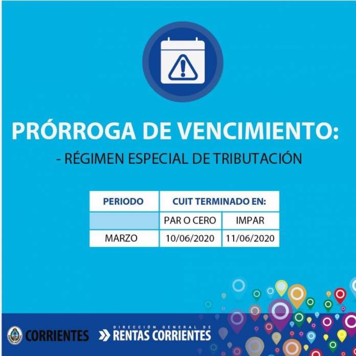 Valdés también resolvió la prórroga de los vencimientos de pago de los contribuyentes del Régimen Especial de Tributación previsto en el artículo 123 bis del Código Fiscal, correspondientes a marzo del ejercicio fiscal 2020, los que se regirán por las fechas de vencimientos que se detallan a continuación: números de CUIT terminados en par o 0 el día 10 de junio de 2020, y números de CUIT terminados en impar el día 11 de junio de 2020.