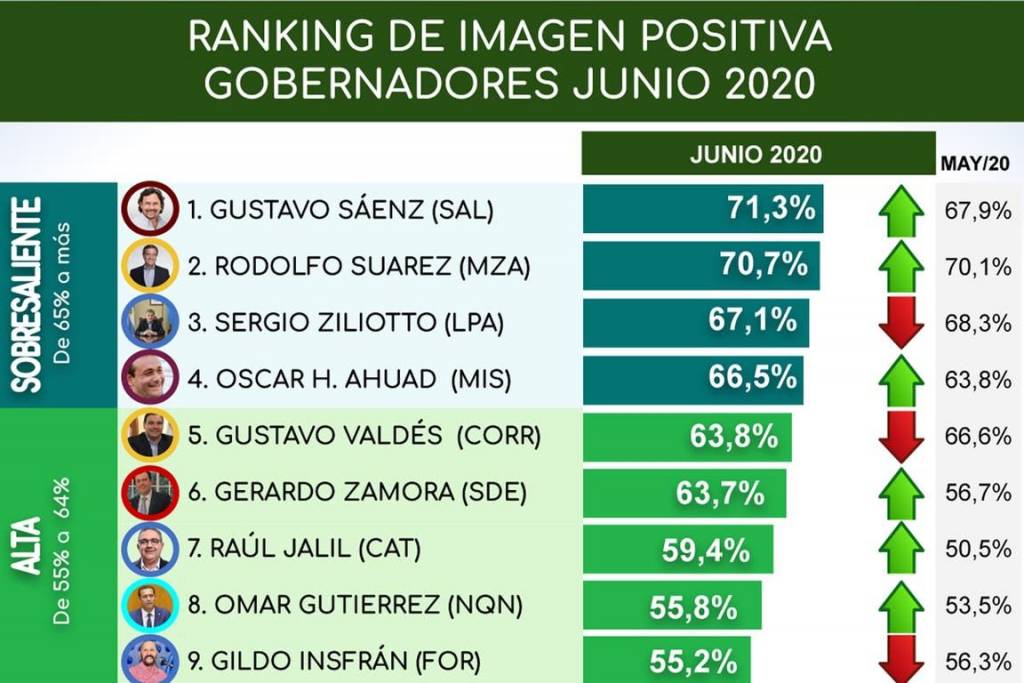 En ese relevamiento, la tabla fue encabezada por el mendocino Suárez (70,1%) y lo seguían en el segundo y tercer lugar Ziliotto (68,3%) y Sáenz (67,9%).