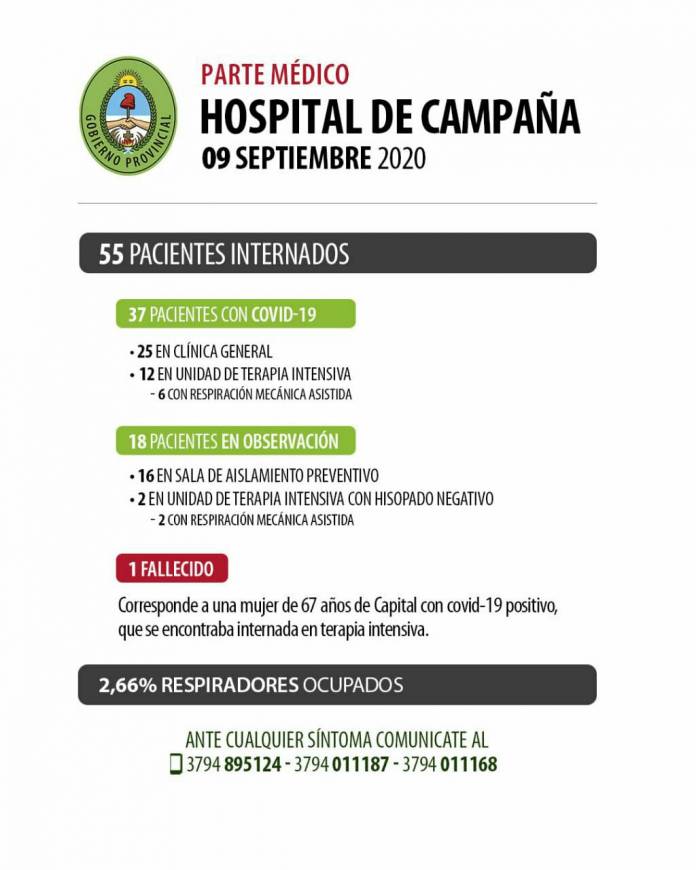 El informe emitido desde la Dirección Ejecutiva de la institución detalla que a la fecha (09 de septiembre), se encuentran internados 55 pacientes, de los cuales 37 tienen diagnóstico de Covid-19 y 18 con sospecha de Covid-19, que se encuentran cumpliendo el aislamiento preventivo.