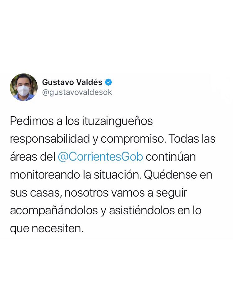 Del mismo modo, pidió “a los ituzaingueños responsabilidad, compromiso” y que “se queden en sus casas”, asegurando “seguir acompañándolos y asistiéndolos en lo que necesiten”, ya que “las áreas del Gobierno de Corrientes continúan monitoreando la situación”.