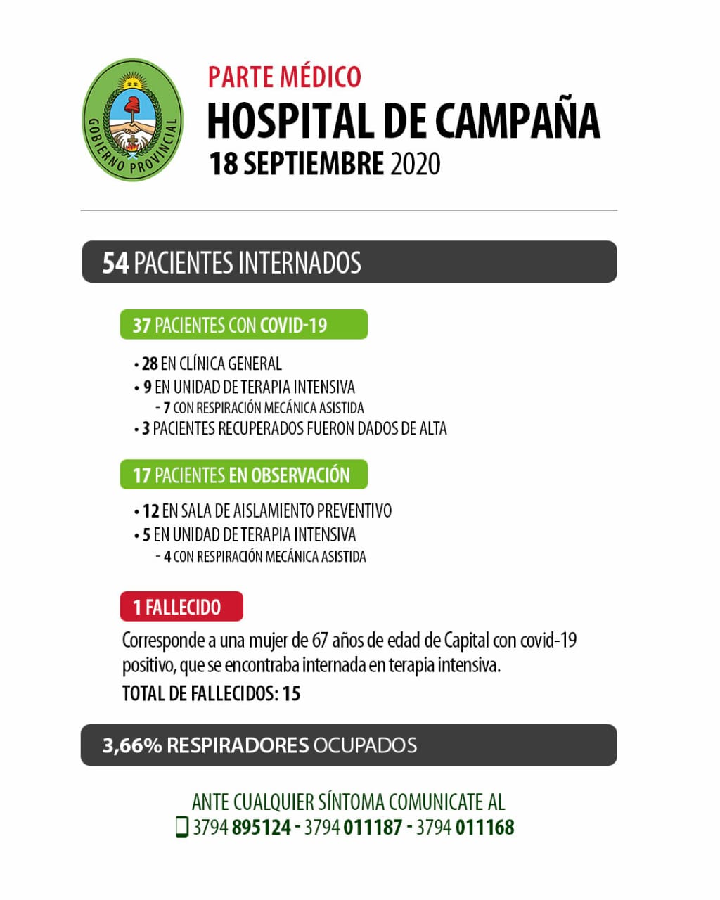 El informe emitido desde la Dirección Ejecutiva del Hospital de Campaña Hogar Escuela detalla que a la fecha (18 de septiembre), se encuentran internados 54 pacientes, de los cuales 37 tienen diagnóstico de Covid-19 y 17 con sospecha de Covid-19, que se encuentran cumpliendo el aislamiento preventivo.