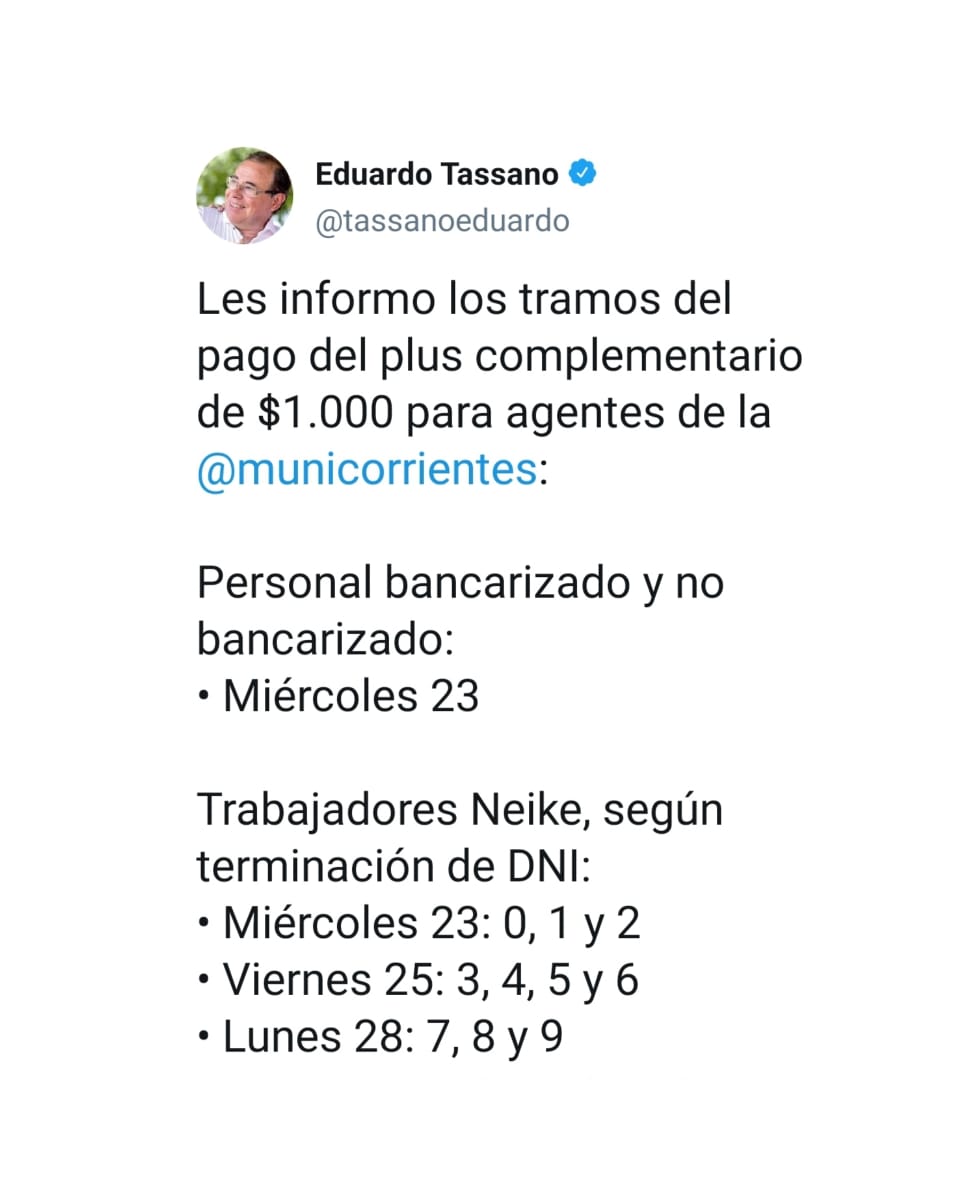 Tal como lo anunció el intendente Eduardo Tassano en su cuenta de Twitter, desde este miércoles 23 se realizará el pago del plus de $ 1.000 para los trabajadores bancarizados. Por su parte, los trabajadores Neike cobrarán según el número de terminación del DNI. La Municipalidad de Corrientes efectivizará desde este miércoles 23 el pago del plus complementario de 1.000 pesos para todo el personal (trabajadores Neike, contratados y planta permanente). El anuncio fue dado a conocer por el intendente Eduardo Tassano a través de su cuenta oficial de Twitter.