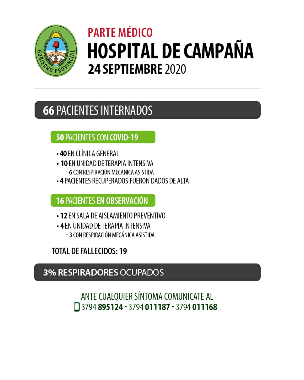 El Ministerio de Salud Pública, comunica el parte médico de los pacientes internados en el Hospital de Campaña Escuela Hogar.