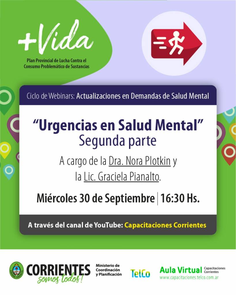 En el marco del trabajo que lleva adelante la cartera conducida por el ministro de Coordinación y Planificación (MCyP), Horacio Ortega, a partir del Plan Provincial de Lucha contra el Consumo Problemático de Sustancia Psicoactivas, denominado +Vida, se realizará este miércoles 30 de septiembre a las 16:30, por webinario, la segunda entrega de la charla “Urgencias en Salud Mental” a cargo de la doctora Nora Plotkin y la Licenciada Graciela Pianalto.