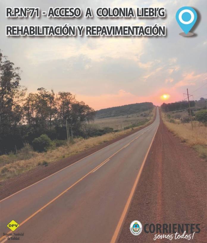 Obra ubicada en el Departamento de Ituzaingó Corrientes, denominado como Acceso a colonia Liebig, en el límite con la provincia de Misiones, más precisamente con Apóstoles. Se reconstruyó y repavimentó con concreto asfáltico, para lo cual se ha invertido un presupuesto de $93.038.672,84 con plazo de ejecución de 29 meses.