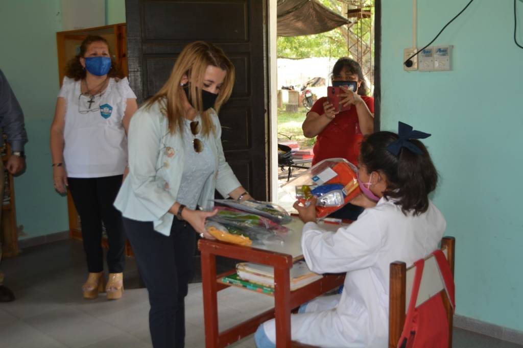 La ministra de Educación Susana Benítez, visitó esta mañana las Escuelas N°756 y 853 de San Cosme y Costa Paraná. En la oportunidad, el Gobierno de la Provincia a través del ministerio de Educación hizo entrega de kits sanitizante y equipamiento escolar a los establecimientos educativos.