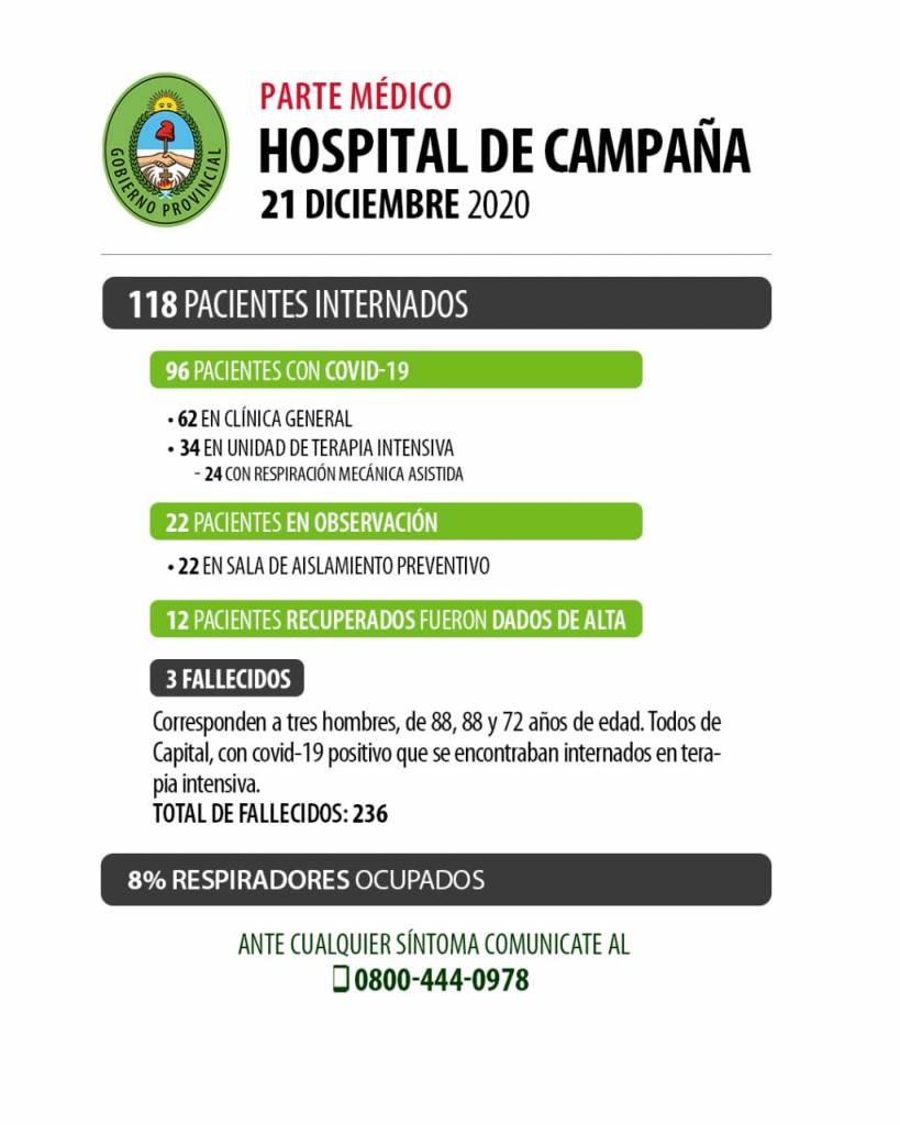 El Ministerio de Salud Pública informó este lunes el parte médico del Hospital de Campaña Escuela Hogar, dando cuenta de la recuperación de 12 pacientes que recibieron el alta, mientras que fallecieron 3 personas con resultado positivo para Covid-19.