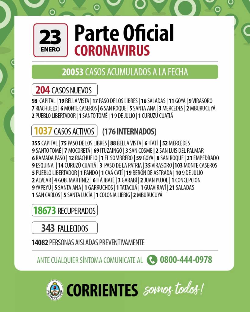 El informe epidemiológico de la provincia de Corrientes registra este sábado 204 casos nuevos de Coronavirus, de los cuales 98 corresponden a la ciudad Capital y los 106 restantes se distribuyen en 15 localidades del interior provincial. Así es que a la fecha (23/01/21) se acumulan 20.053 casos, de los cuales 1.037 permanecen activos, con 18.673 recuperados, 343 fallecidos, mientras 176 personas permanecen internadas en el Hospital de Campaña y 14.082 aisladas preventivamente.