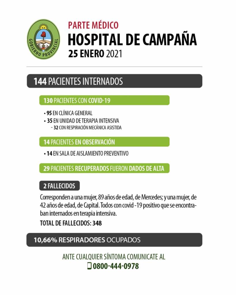 El Ministerio de Salud Pública informó este lunes el parte médico del Hospital de Campaña Escuela Hogar, dando cuenta de la recuperación de 29 pacientes que recibieron el alta, mientras que fallecieron 2 personas con resultado positivo para Covid-19.