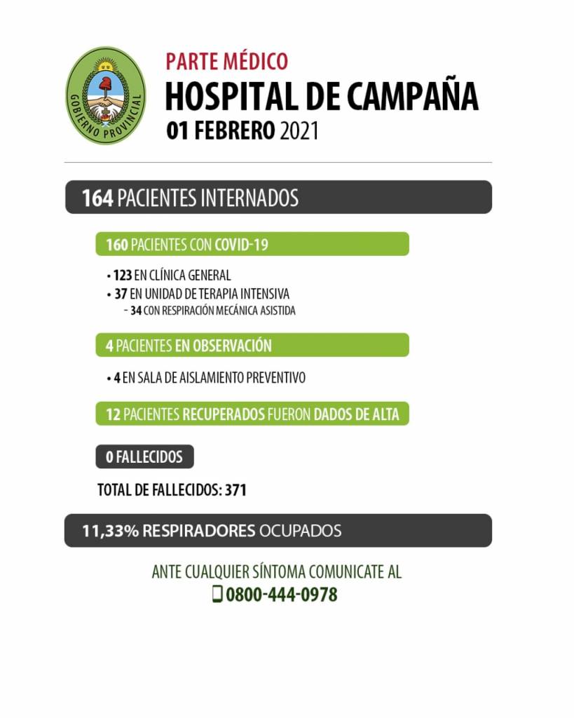 El informe emitido desde la institución detalla que a la fecha (01 de febrero), se encuentran internados 164 pacientes, de los cuales 160 tienen diagnóstico de Covid-19 y 4 sospecha de Covid-19.