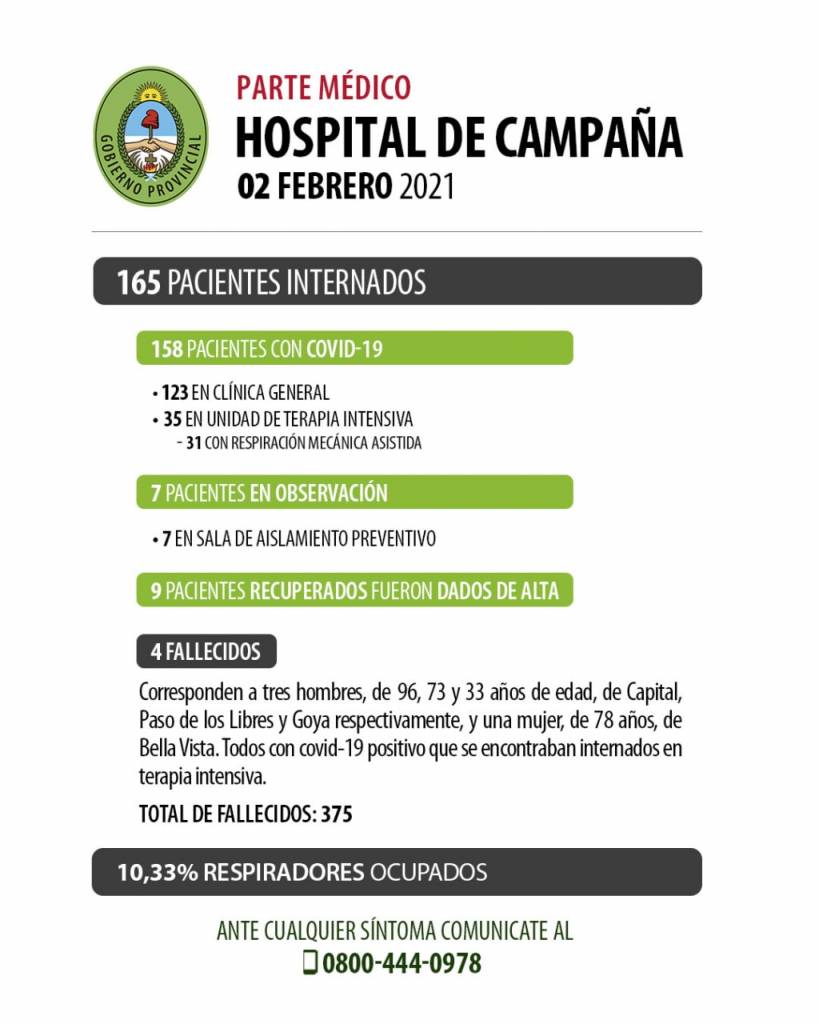 El informe emitido desde la institución detalla que a la fecha (02 de febrero), se encuentran internados 165 pacientes, de los cuales 158 tienen diagnóstico de Covid-19 y 7 sospecha de Covid-19.