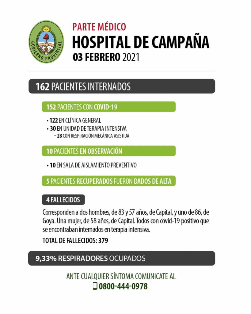 El Ministerio de Salud Pública informó este miércoles el parte médico del Hospital de Campaña Escuela Hogar, dando cuenta de la recuperación de 5 pacientes que recibieron el alta, mientras que fallecieron 4 personas con resultado positivo para Covid-19.