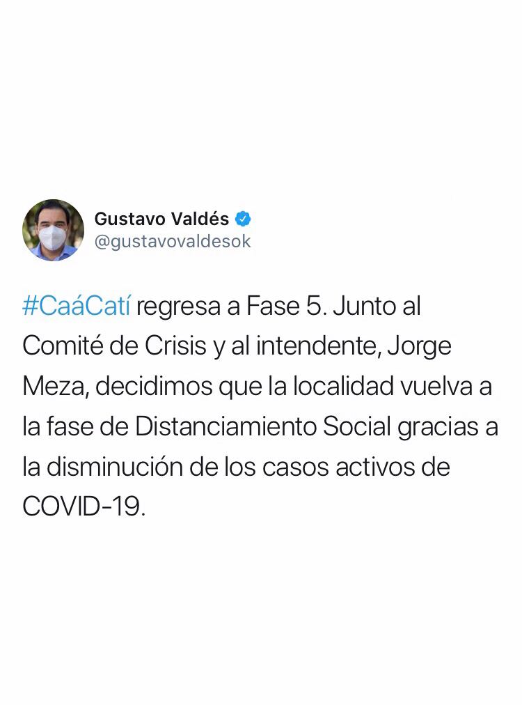 Y para el caso de Caá Catí, indicó que el regreso a Fase 5 fue una decisión junto al Comité de Crisis y al intendente, Jorge Meza, gracias a la disminución de los casos activos de COVID-19 en esa localidad.
