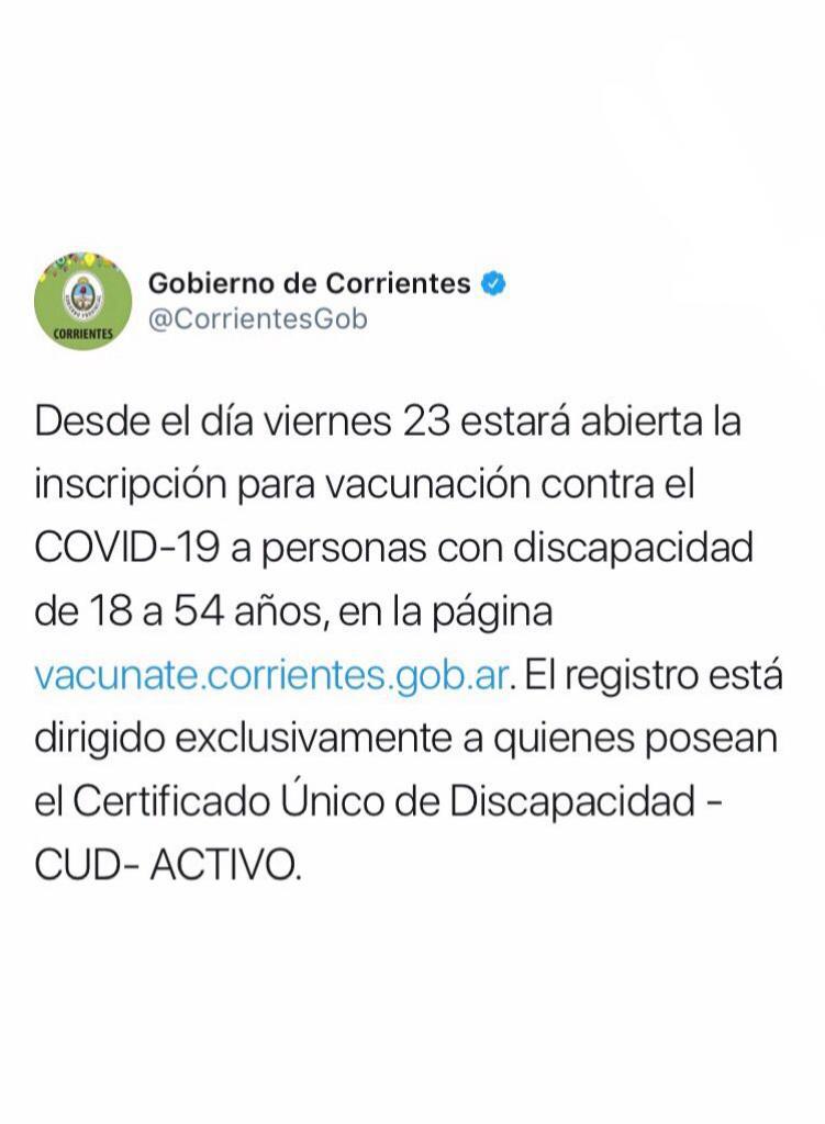 El Gobierno provincial anunció que desde el viernes 23 del corriente mes estará abierta la inscripción para vacunación contra el Covid-19 a personas con discapacidad de 18 a 54 años. Teniendo en cuenta que el registro está dirigido exclusivamente a quienes posean el Certificado Único de Discapacidad -CUD- ACTIVO.