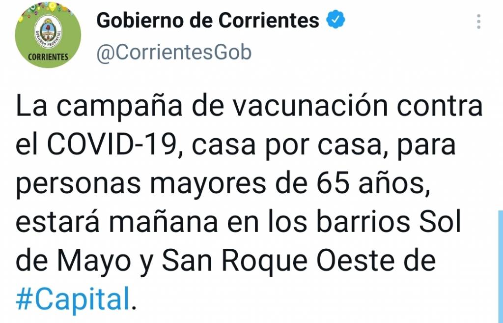 La campaña de vacunación Covid-19 casa por casa continuará hoy lunes 26 en los barrios Sol de Mayo y San Roque Oeste de la Capital. Allí, los agentes sanitarios estarán inmunizando a mayores de 65 años que todavía no se aplicaron la dosis.