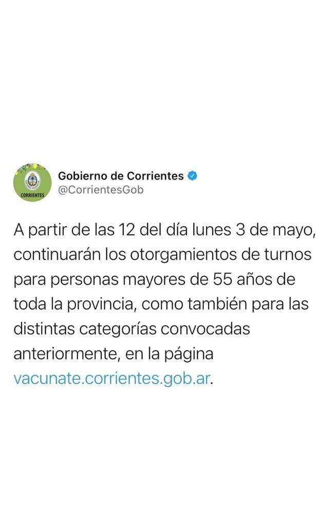 El gobierno provincial comunicó que “A partir de las 12 del día lunes 3 de mayo, continuarán los otorgamientos de turnos para personas mayores de 55 años de toda la provincia, como también para las distintas categorías convocadas anteriormente, en la página https://t.co/wbRzSh2taU “.