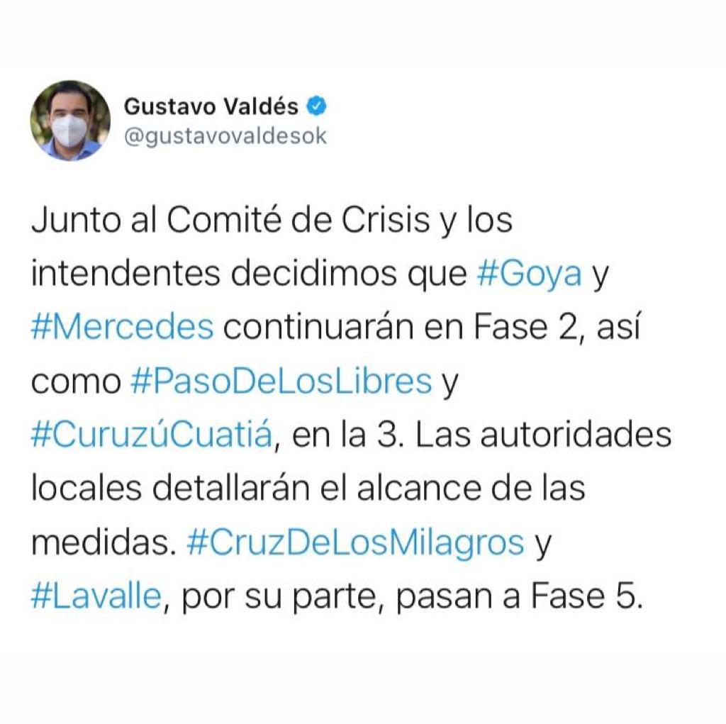 El gobernador Gustavo Valdés comunicó mediante su cuenta de twitter, como prosiguen las fases de aislamiento social, preventivo y obligatorio en varias comunas de la Provincia, en el marco de las medidas para hacer frente a la pandemia por Covid-19, las que se tomaron de común acuerdo a con los intendentes locales y el Comité de Crisis.
