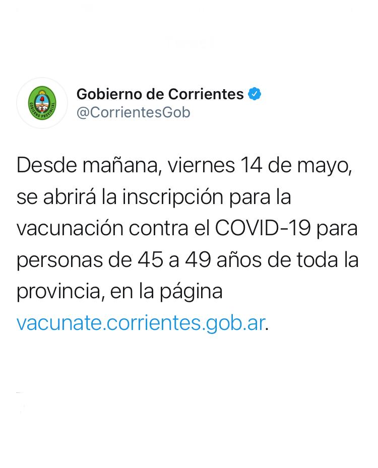 El Gobierno provincial informó que desde mañana, viernes 14 de mayo, se abrirá la inscripción para la vacunación contra el COVID-19 para personas de 45 a 49 años de toda la provincia, en la página vacunate.corrientes.gob.ar.