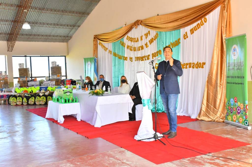 En otra recorrida por el interior provincial, el mandatario habilitó en el citado establecimiento, 4 nuevas aulas y aseguró seguir avanzando con su refacción total e instalaciones deportivas, para fortalecer su funcionamiento. Entregó además netbooks, equipamiento escolar y otros elementos a instituciones educativas de la zona y, en el Polideportivo Municipal, bienes de Capital del programa “Emprendedores Somos Todos”.