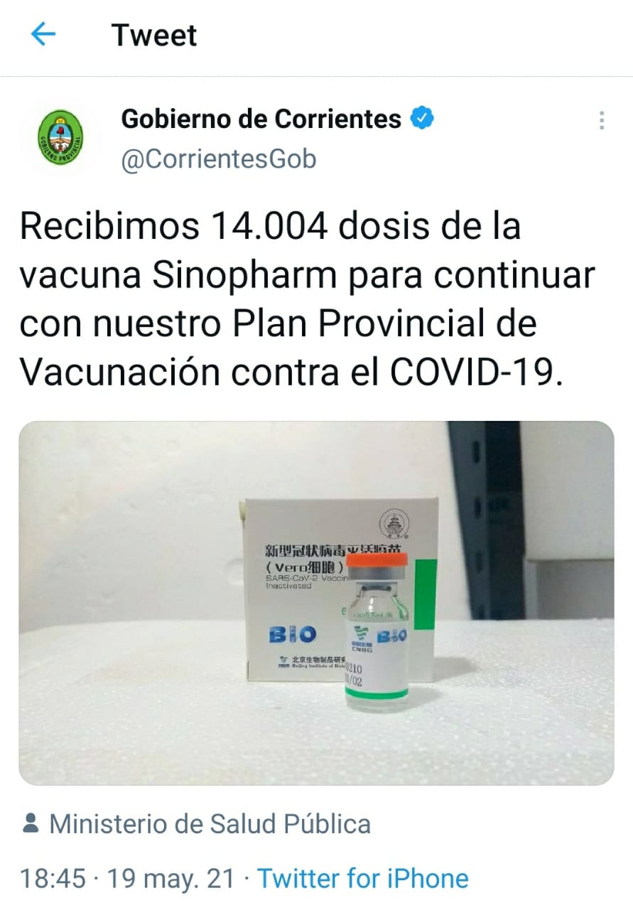 Municipios Llegaron a Corrientes 14.004 dosis de la vacuna Sinopharm Por Reporte Corrientes - mayo 20, 2021 0 1309 Compartir Facebook Twitter Google+ Pinterest WhatsApp Linkedin Email Telegram El Gobierno de Corrientes anunció por medio del Twitter oficial (@CorrientesGob), que llegaron 14.004 dosis de la vacuna Sinopharm para continuar con el Plan Provincial de Vacunación contra el COVID-19.