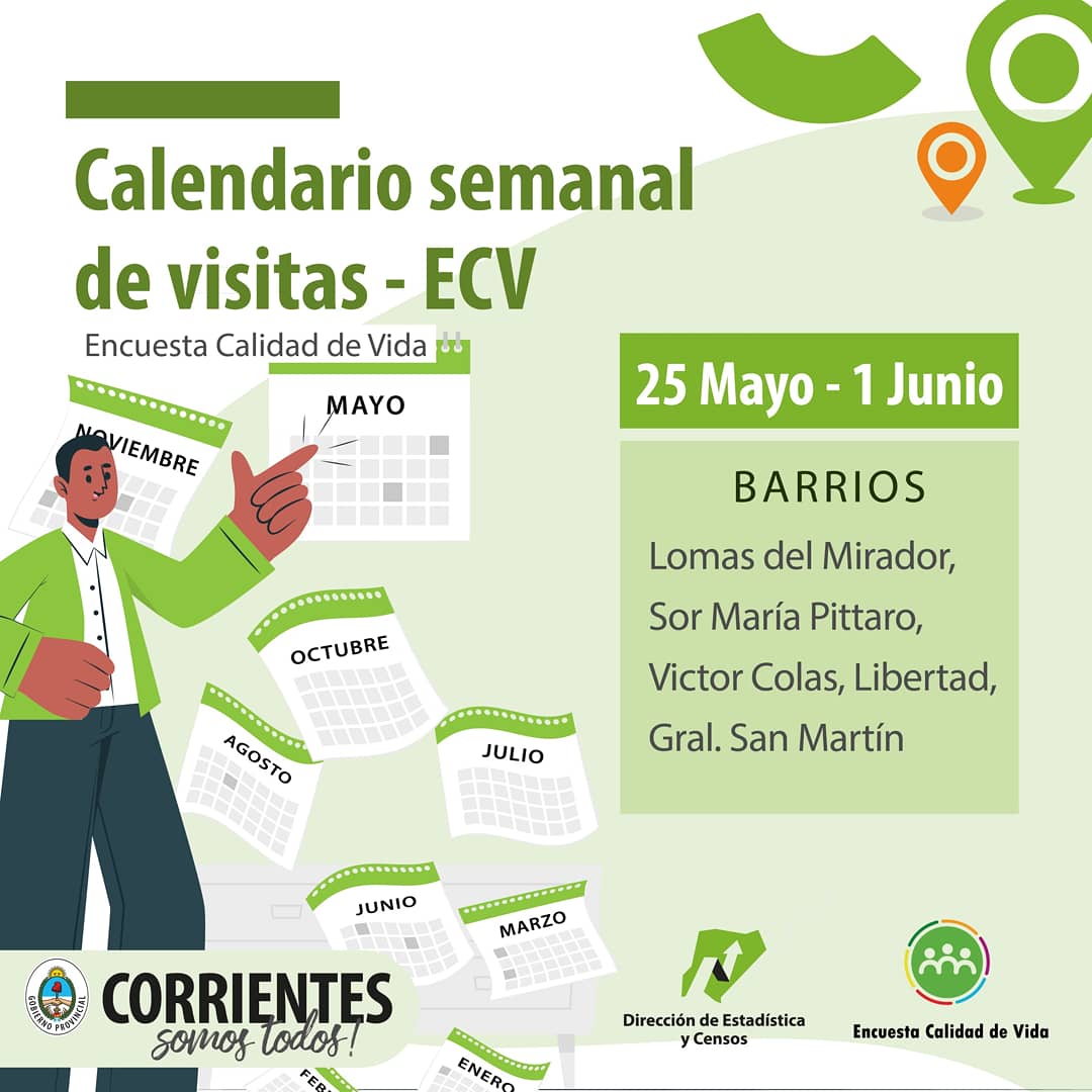 Entre el 23 de mayo y el 1 de junio próximo, la Dirección de Estadística y Censos de Corrientes da continuidad a las encuestas Permanente de Hogares y la de Calidad de Vida. En conjunto con este segundo relevamiento también se encuesta sobre el Uso del Tiempo. Los integrantes de los equipos de encuestadores están identificados y vistan Laguna Seca, Víctor Colas, Lomas del Mirador; Sor María Pittaro; Ex Aero Club; Libertad; Juan XXIII; y General San Martín.
