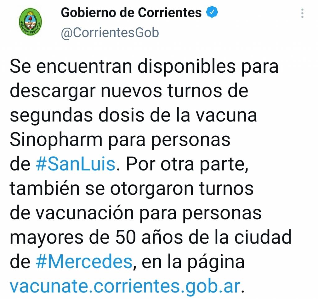 “Se encuentran disponibles para descargar nuevos turnos de segundas dosis de la vacuna Sinopharm para personas de #SanLuis. Por otra parte, también se otorgaron turnos de vacunación para personas mayores de 50 años de la ciudad de #Mercedes, en la página vacunate.corrientes.gob.ar.”