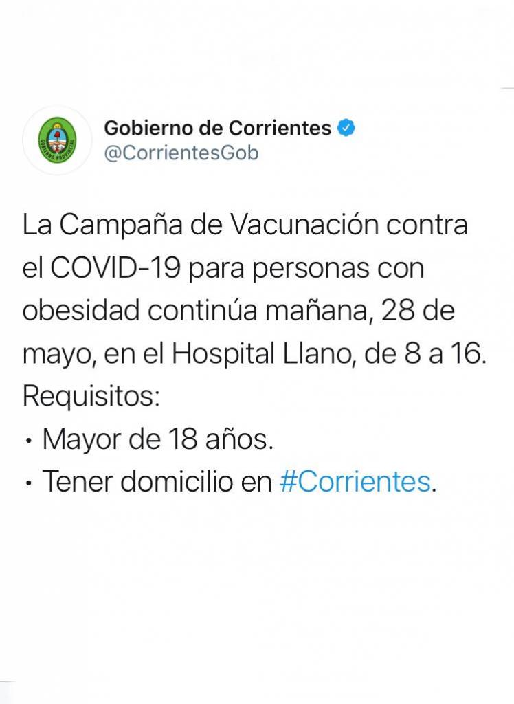 El gobierno provincial comunicó por medio de su Twitter oficial que la Campaña de Vacunación contra el COVID-19 para personas con obesidad continúa el viernes 28 de mayo, en el Hospital Llano, de 8 a 16. Además, recuerda los requisitos para la vacunación, que consisten en ser mayores de 18 años y tener domicilio en Corrientes.