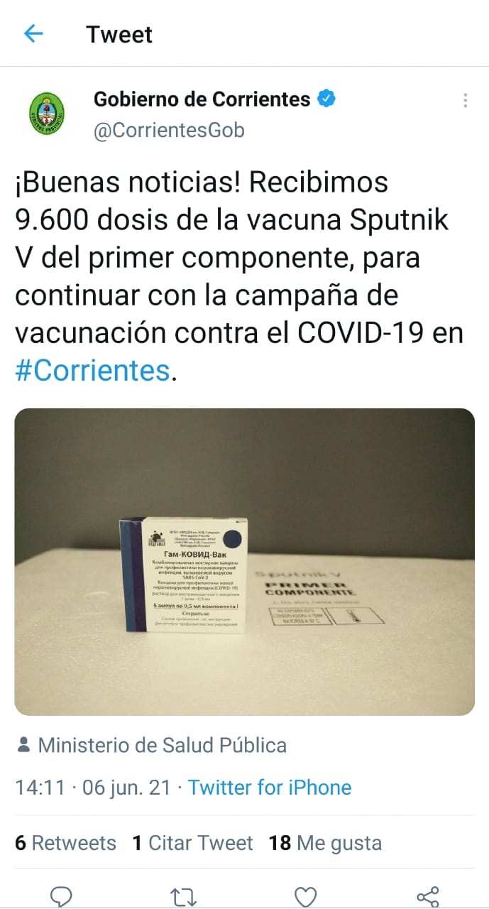 DestacadosPolitica Llegaron a Corrientes 9.600 dosis de vacunas Sputnik V Por Reporte Corrientes - junio 7, 2021 0 1271 Compartir Facebook Twitter Google+ Pinterest WhatsApp Linkedin Email Telegram El Gobierno de Corrientes por medio de su cuenta oficial de Twitter anunció la llegada de 9.600 dosis de la vacuna Sputnik V del Primer componente para continuar con la Campaña de Vacunación contra el COVID-19 en toda la provincia.
