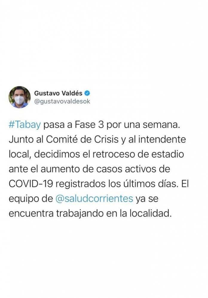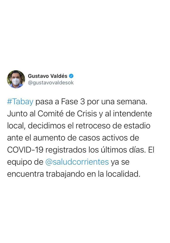 El mandatario provincial Gustavo Valdés a través de su cuenta oficial de Twitter, anunció que en forma conjunta con el Comité de Crisis y el intendente local Juan Miguel Miño, se decidió que Tabay pase a Fase 3, con todas las restricciones que ello implica en el plan de acción que la Provincia lleva adelante para contener la pandemia del Covid-19. Se puntualiza que la medida fue adoptada en virtud del aumento de casos activos de la mencionada afección registrada en los últimos días. La información también consigna que el equipo de Salud de la Provincia se encuentra en la localidad.