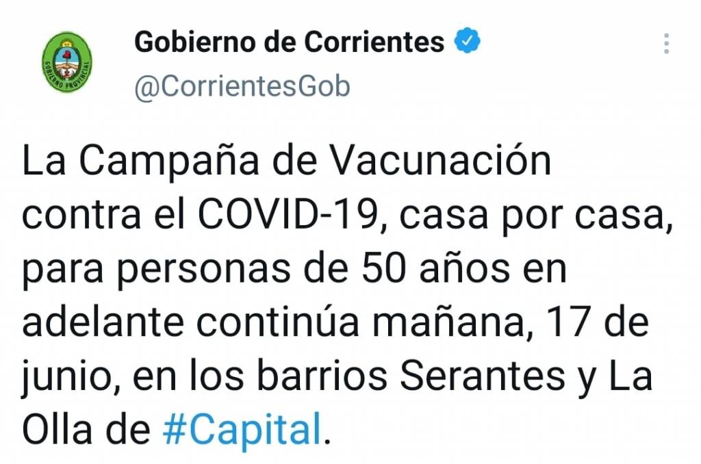 Con la visita casa por casa del personal del Ministerio de Salud, el Gobierno de Corrientes continuará este jueves 17 de junio, la campaña de vacunación contra el COVID-19 para personas de 50 años en adelante, en los barrios Serantes y La Olla de la Capital provincial.