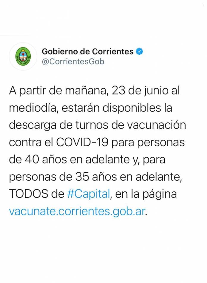 El Gobierno provincial por medio de su Twitter oficial anunció que a partir de este miércoles 23 de junio al mediodía “estará disponible la descarga de turnos de vacunación contra el COVID-19 para personas de 40 años en adelante y, para personas de 35 años en adelante” de Capital.