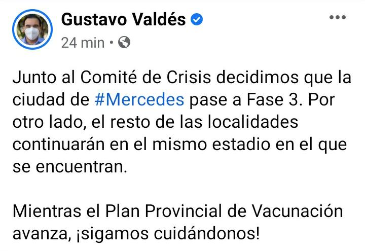 Mediante su cuenta de twitter, el gobernador Gustavo Valdés anunció que la ciudad de Mercedes pasa a fase 3 del aislamiento preventivo y obligatorio, en una decisión que se tomó junto al Comité de Crisis.