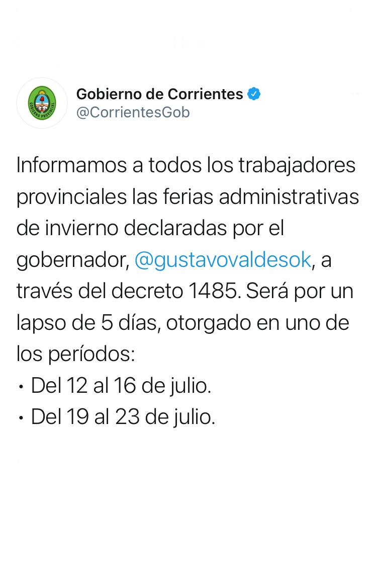 A través del Decreto 1485, el gobernador Gustavo Valdés determinó la feria administrativa de invierno para el personal de las reparticiones de la administración pública provincial central, organismos descentralizados y autárquicos, la que será utilizada por los agentes en uno de los períodos comprendidos, entre el 12 y el 16 de julio de 2021, y el 19 y el 23 de julio de 2021, respectivamente, con excepción de las áreas de Salud, Seguridad, el Instituto de Cardiología y la Dirección Provincial de Energía (DPEC), en las que cada titular de dichas reparticiones tomará las medidas necesarias para que el personal a su cargo utilice esta feria administrativa en el período establecido.