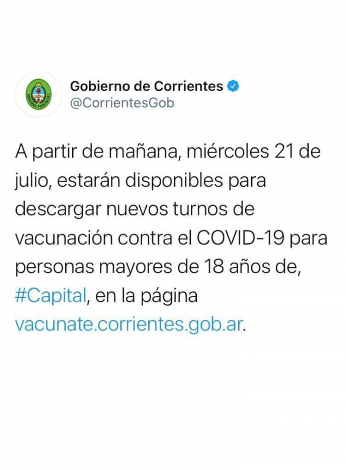 El Gobierno provincial informó que a partir de mañana, miércoles 21 de julio, estarán disponibles para descargar nuevos turnos de vacunación contra el COVID-19 para personas mayores de 18 años de Capital, en la página vacunate.corrientes.gob.ar.