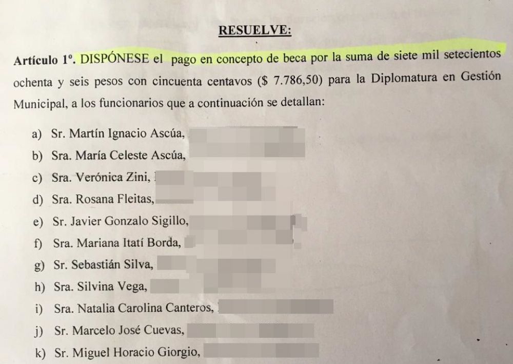 La inédita resolución dispone que se le pague un monto de $7.786,50 a cada uno de los aspirantes a la “Diplomatura en Gestión Municipal”, entre los que se encuentran el Intendente, el Vice, Concejales y funcionarios de alto rango del gabinete