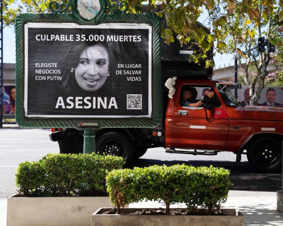 “Culpable de 35.000 muertes”, afirma el cartel con la imagen de la vicepresidenta en blanco y negro, y se estima que hace referencia al número de bajas producto a la invasión rusa en Ucrania brindada por el presidente Volodymyr Zelensky. En el afiche figura también a la frase: “Elegiste negocios con Putin en lugar de salvar vidas”. Junto a la foto, se deja ver un código QR con un link bajo el título de “cfkladrona” que redirigía al sitio “cristinauta.org”. La URL fue dada de baja durante las primeras horas del lunes.