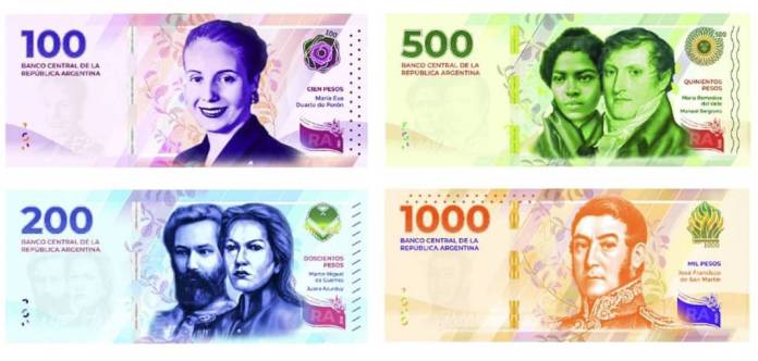 Eva Perón vuelve con nuevo diseño al billete de $100; Martín Miguel de Güemes y Juana Azurduy estarán en el de 200; Manuel Belgrano y María Remedios del Valle en el de 500 y José de San Martín en el de 1.000.