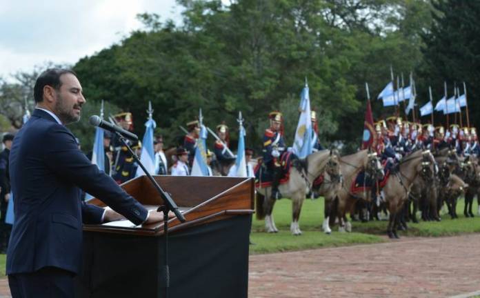 Para dar inicio al acto, el jefe de la Agrupación Libertador, Teniente Coronel Agustín Luzuriaga presentó a los efectivos formados al gobernador de la provincia Gustavo Valdés, quien pasó revista y saludó a la formación acompañado por el Comandante de la Primera División de Ejército General de Brigada, Aldo Ferrari y la intendenta de Yapeyú, Marisol Fagundez.