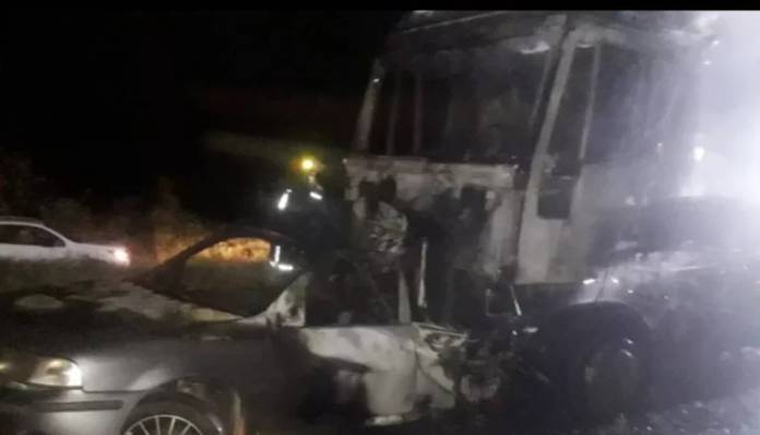 El choque se produjo entre un auto y un camión. Ambos vehículos se prendieron fuego.