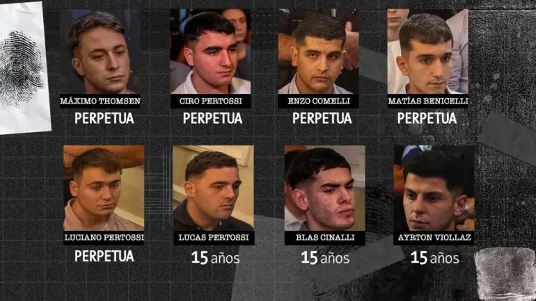 Máximo Thomsen, Ciro Pertossi, Enzo Comelli, Matías Benicelli y Luciano Pertossi fueron condenados a prisión perpetua por ser coautores del crimen. Los tres acusados restantes recibieron penas como partícipes secundarios.