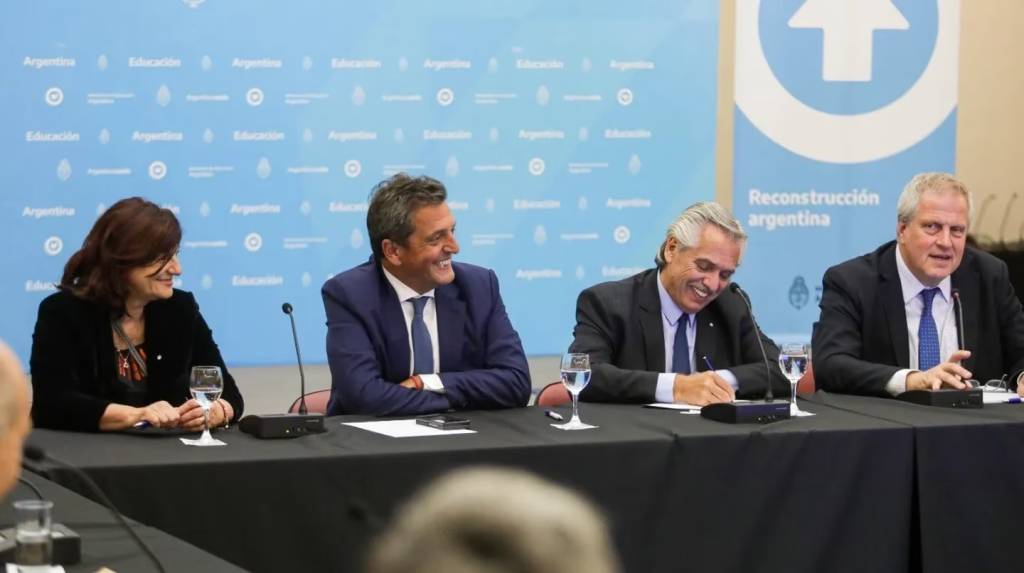 Por lo pronto, el acuerdo que se cerró el viernes en el Ministerio de Educación de la Nación establece 33,5 % hasta julio próximo, a abonar un 17,5 % en marzo, 8 % en mayo y 8 % en julio. Firmaron los cinco sindicatos: Confederación de Trabajadores de la Educación de la República Argentina (Ctera); Sindicato Argentino de Docentes Privados (Sadop); la Unión de Docentes Argentinos (UDA); la Asociación del Magisterio de Enseñanza Técnica (Amet) y la Confederación de Educadores Argentinos (CEA). Asistieron al encuentro el presidente Alberto Fernández, el ministro Sergio Massa, la ministra de Trabajo, Kelly Olmos, y por supuesto el anfitrión, Jaime Perczyk.