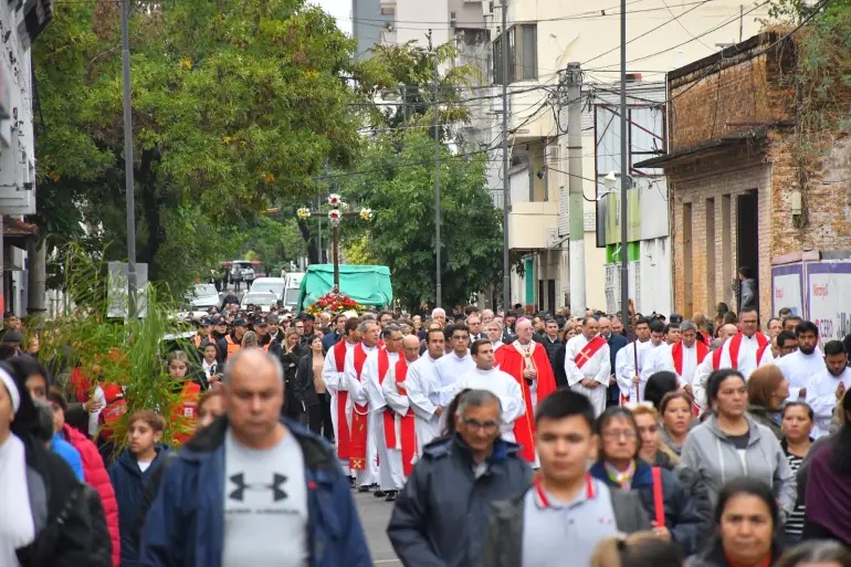La tradicional Cruz de los Españoles adornada con flores rojas y amarillas encabezó la procesión de la que formaron parte alumnos de la catequesis de la Santísima Cruz de los Milagros; Catequesis de la Parroquia de Nuestra Señora del Rosario de la Iglesia Catedral; Escuela Profesional María de Nazareth; Escuela Profesional “Nuestra Señora de Itatí” de Laguna Brava; Instituto Santa Teresita del Niño Jesús; San Jerónimo; Capilla San Pablo; Parroquia Cristo Obrero; San Pablo; Apostolado de la Dulce Espera; Parroquia San Benito; San Pío X; Beata Laura Vicuña y Domingo Savio; María Auxiliadora; Comunidad Santo Francisco y Jacinta (Pastorcitos de Fátima); Legión de María; Curia María Aurora de la Salvación; Nuestra Señora de la Medalla Milagrosa; Santa Ana; San Joaquín; Nuestra Señora de Pompeya; San Miguel Arcángel; Santa Ana; Virgen del Rosario; Jesús Misericordioso; San Roque; Santa Filomena; Parroquia Nuestra Señora del Valle; Nuestra Señora de Guadalupe; San Juan Bautista; Comunidad de San José Obrero; Virgen del Rosario; Nuestra Señora de la Merced.
