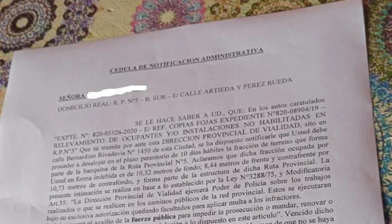 La notificación, emitida el 21 de junio, señala: “Usted debe proceder a desalojar, en el plazo perentorio de 10 días hábiles, la fracción de terreno que forma parte de la banquina de la ruta provincial 5”. Asimismo, en el documento se advierte que “la Dirección Provincial de Vialidad ejercerá poder de policía sobre los trabajos realizados o que se realicen en los caminos públicos de la red provincial”. Además remarca que podrían pagar una multa si no cumplen con la disposición.
