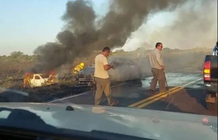 El impacto fue tan violento que los dos vehículos de menor tamaño, el Chevrolet Onix y el Toyota Corolla, se prendieron fuego en el lugar del siniestro. Afortunadamente, se reportaron solo daños materiales y no se informaron heridos.