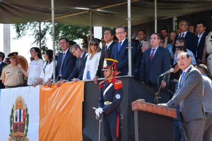 Luego, el comandante de la Primera División del Ejército invitó, a la vicepresidenta de la Nación, Victoria Villarruel, al gobernador Gustavo Valdés y a la intendente municipal, Marisol Fagundez, a saludar a la agrupación El Libertador, quienes efectuaron sus respectivos saludos a las filas.