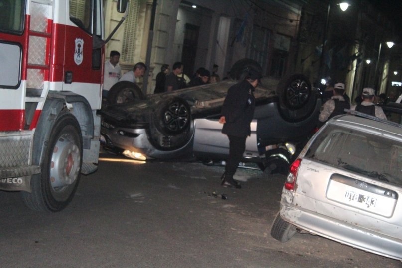 Alrededor de las 21, las sirenas de los bomberos alertaron a todo el microcentro de que algo grave ocurría. El tránsito se interrumpió en calle La Rioja y 9 de Julio. Una cuadra después un vehículo había volcado en posición contraria a la circulación del tránsito, por calle 9 de Julio casi Rioja.