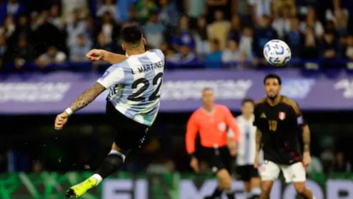 Martínez, que se desmarcó del defensor que lo perseguía al volver sobre sus pasos, se arrojó al aire y empalmó el balón con una tijera que fue incontenible para el arquero Pedro Gallese. Una acción exquisita, por la invención de Leo y la resolución del jugador de Inter de Italia. Y el gol 1999 en la historia del seleccionado argentino.